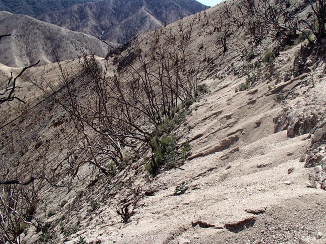 Pete Fish's Trail Gorillas continue working in the 2009 Station Fire burn area. Pete has been working the area, heavily-infested with toxic Poodledog Bush, every spring. This spring after clearing the many blowdowns and starting work on the PDB, several windstorms occurred that blew down dozens more burnt trees, delaying clearing out the PDB as Pete and the TG's cleared the trees again. On Saturday our crew cleared the last tree (a big one), and finished brushing Mile 428. According to Pete, trail miles 412 thru 434 are now cleared.